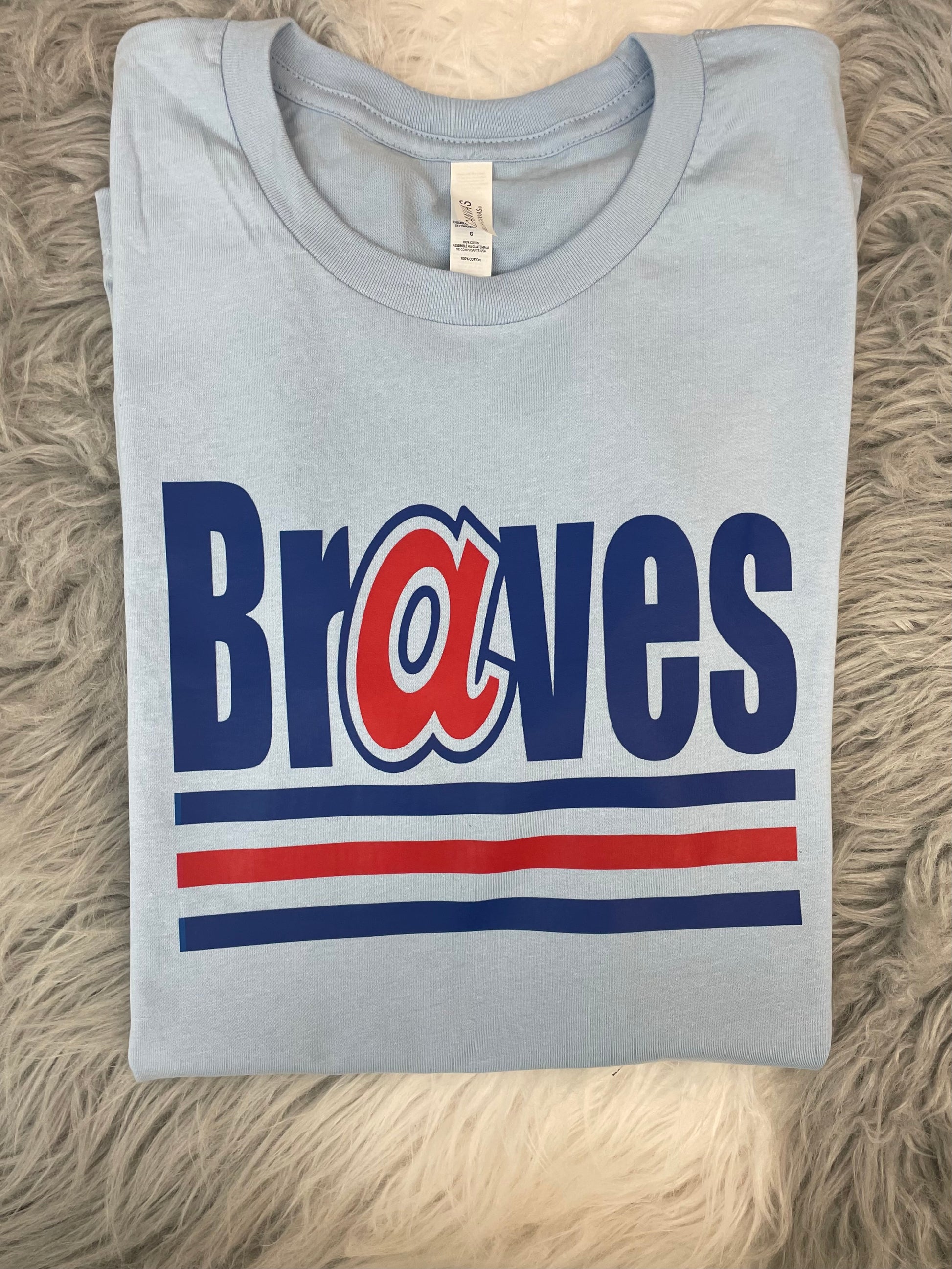 Score a home run in style with our Baby Blue Braves Tee! This unisex tee features a cool and chic baby blue color that adds a trendy touch to your wardrobe. Perfect for any Braves fan, this tee is a must-have for any game day outfit.