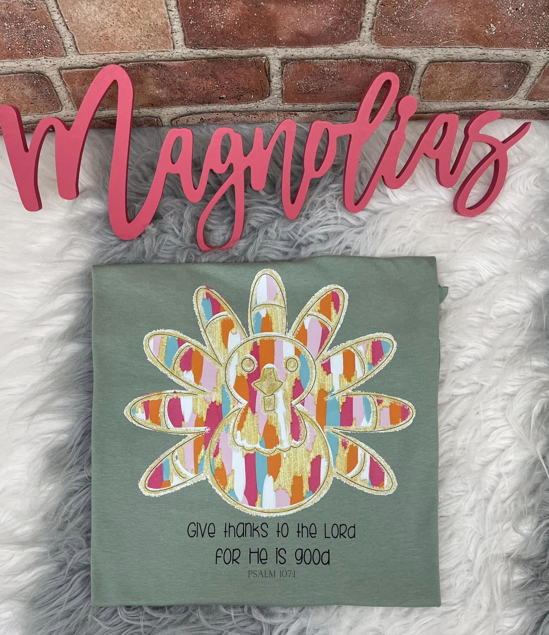 Gobble up this playful tee with a colorful twist! Featuring a vibrant turkey design made with water colors, this tee will bring a burst of fun to any outfit. (A real head-turner, perfect for any quirky fashionista!)