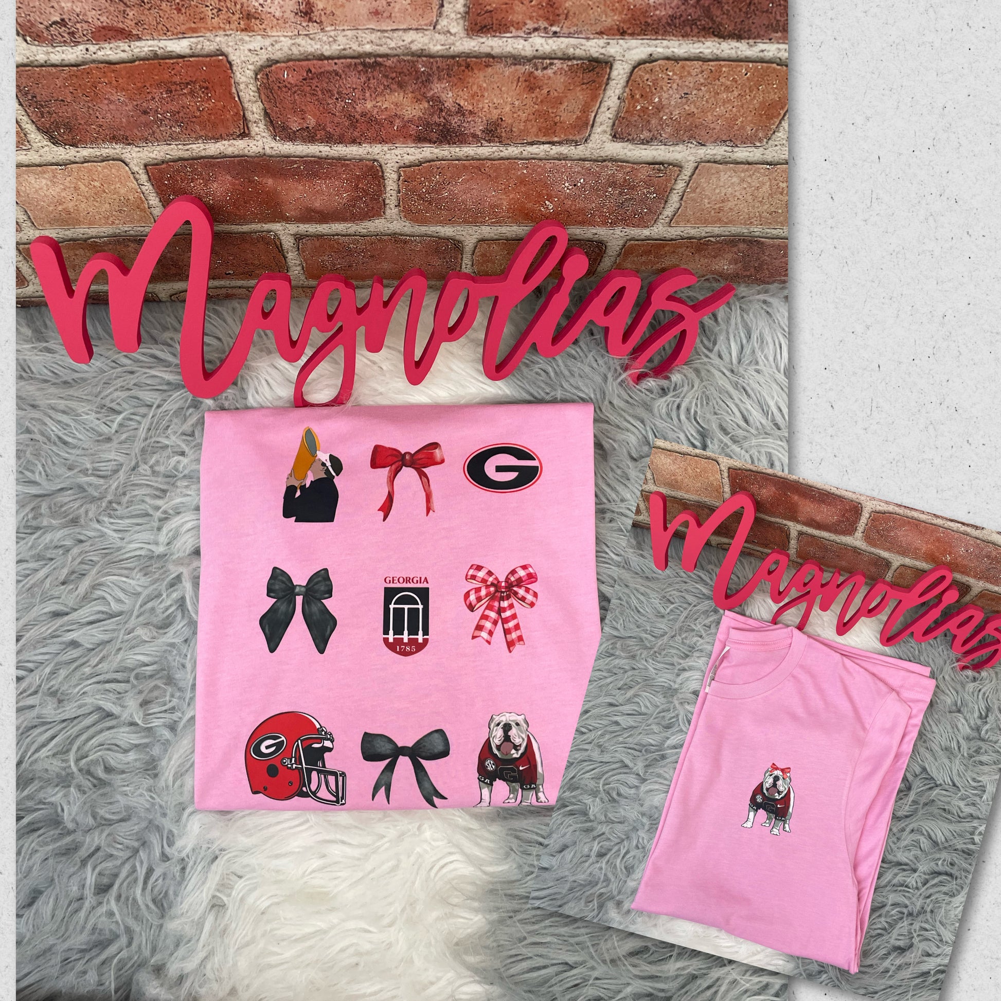 Score a touchdown in style with the Ga Bulldogs Coquette Tee! This pink tee boasts a playful attitude with a coquette design and a fierce bulldog print. Show off your team spirit while looking fun and fashionable.
