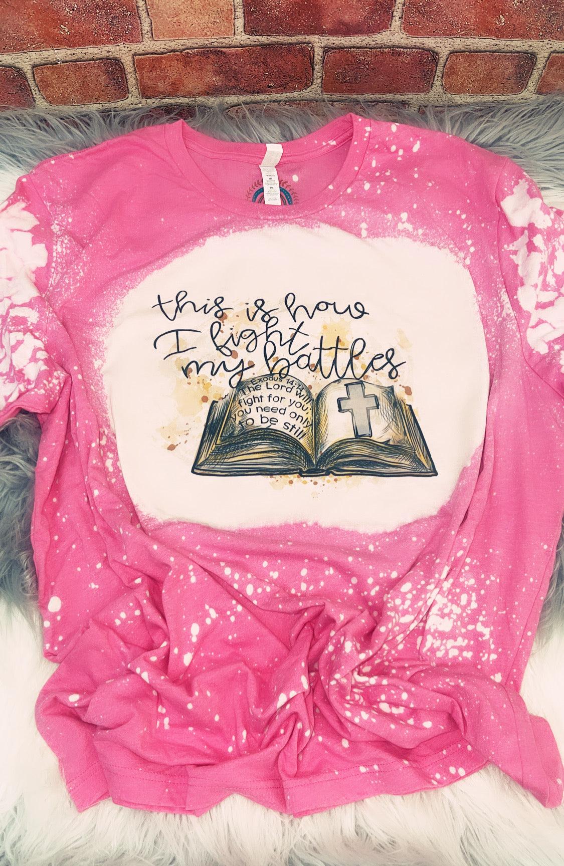 "How I Fight My Battles" is a pink bleached tee featuring a reminder of how to face challenges: with faith. Show your resilience and strength to the world with this stylish and supportive garment.